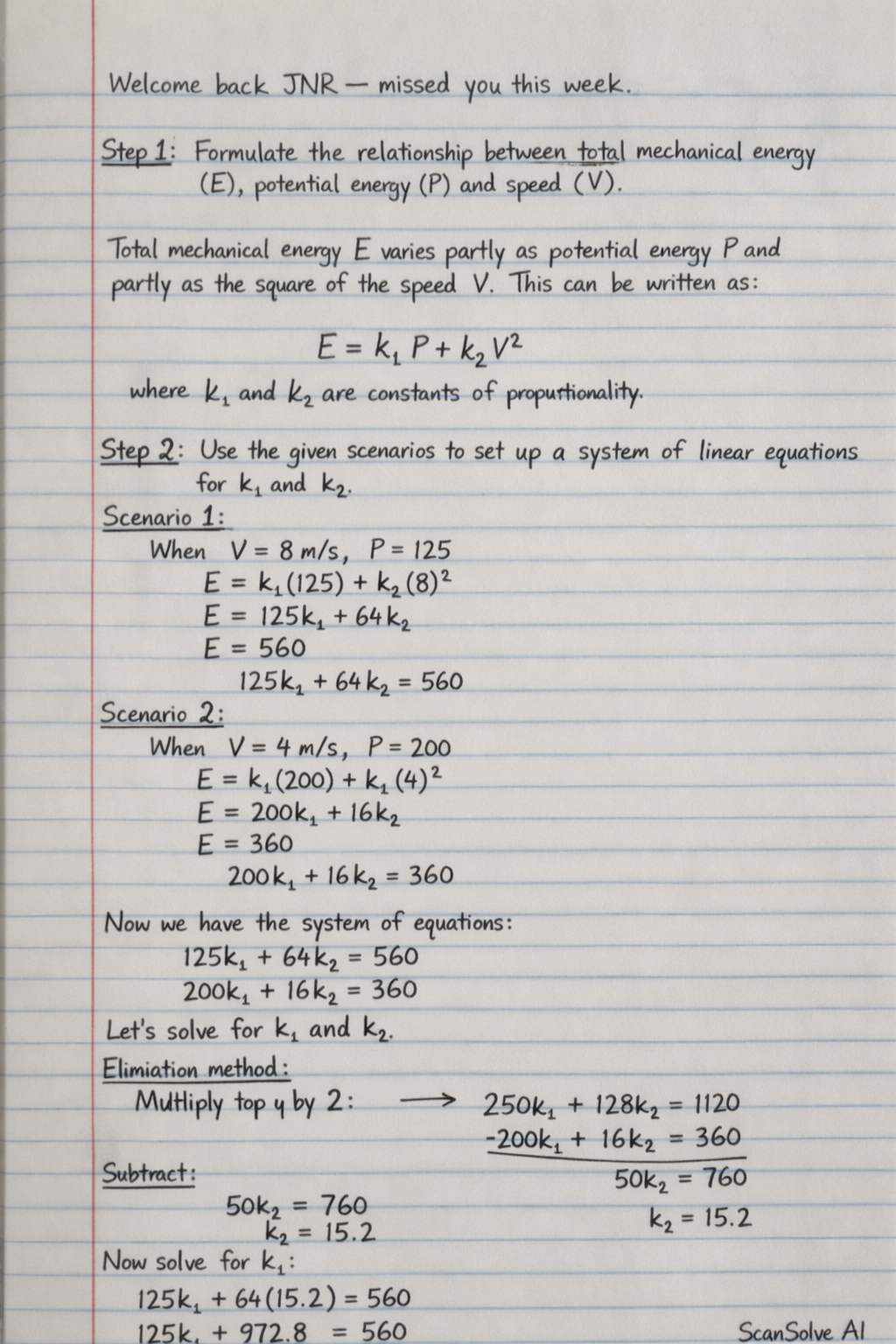 The problem states that the total mechanical energy E varies partly as the potential energy P and partly as the square of the speed V. This can be written as: