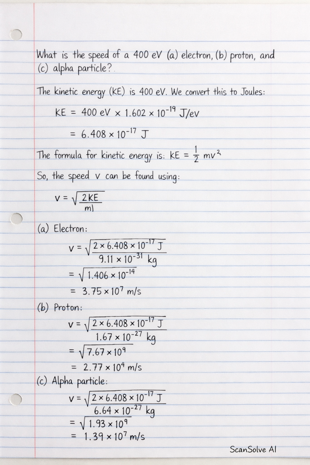 $$ KE = 400 \text{ eV} \times (1.602 \times 10^{-19} \text{ J/eV}) = 6.408 \times 10^{-17} \text{ J} $$