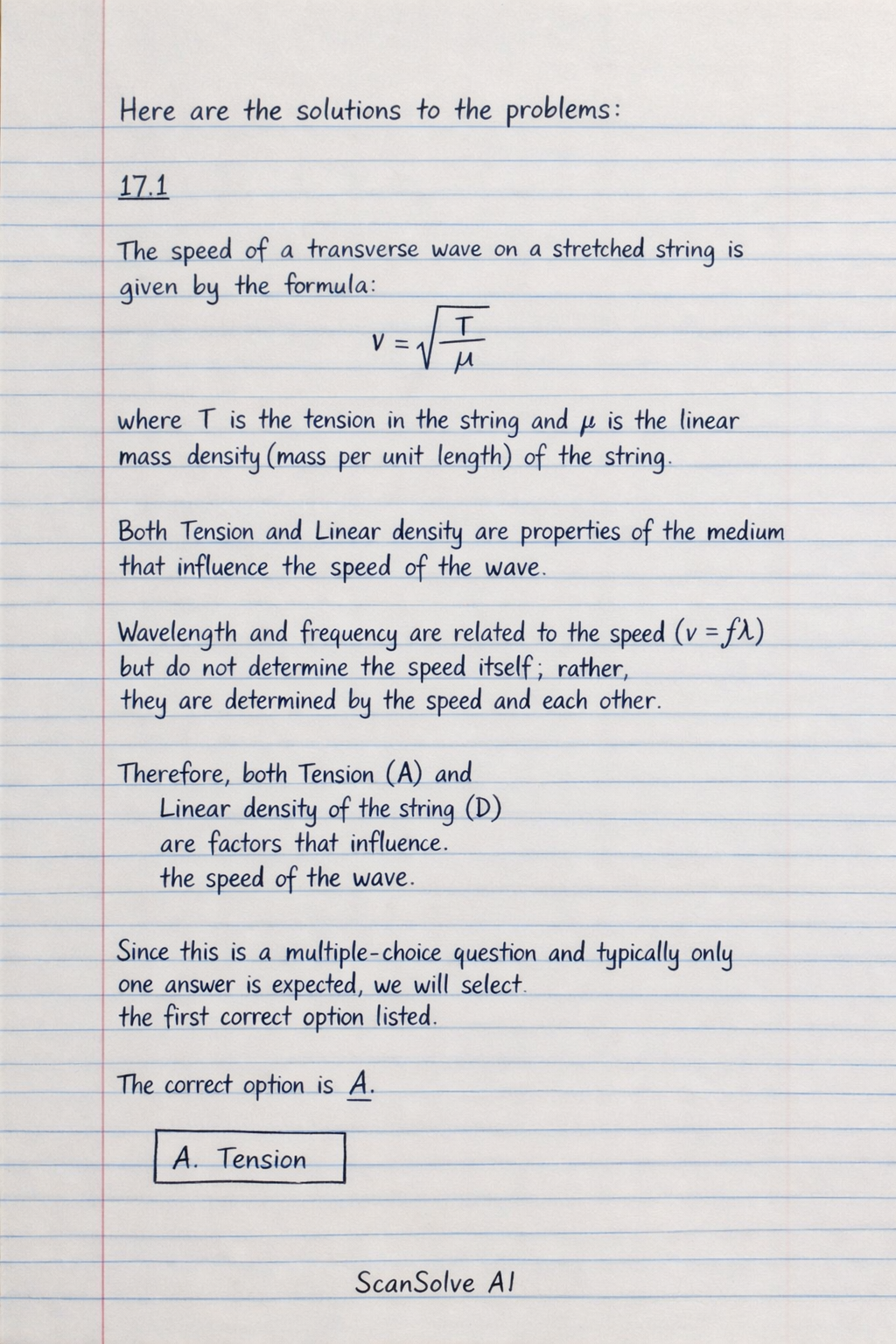Physics: The speed of a transverse wave on a stretched string is given by the formula v =... — Step-by-Step Solution | ScanSolve