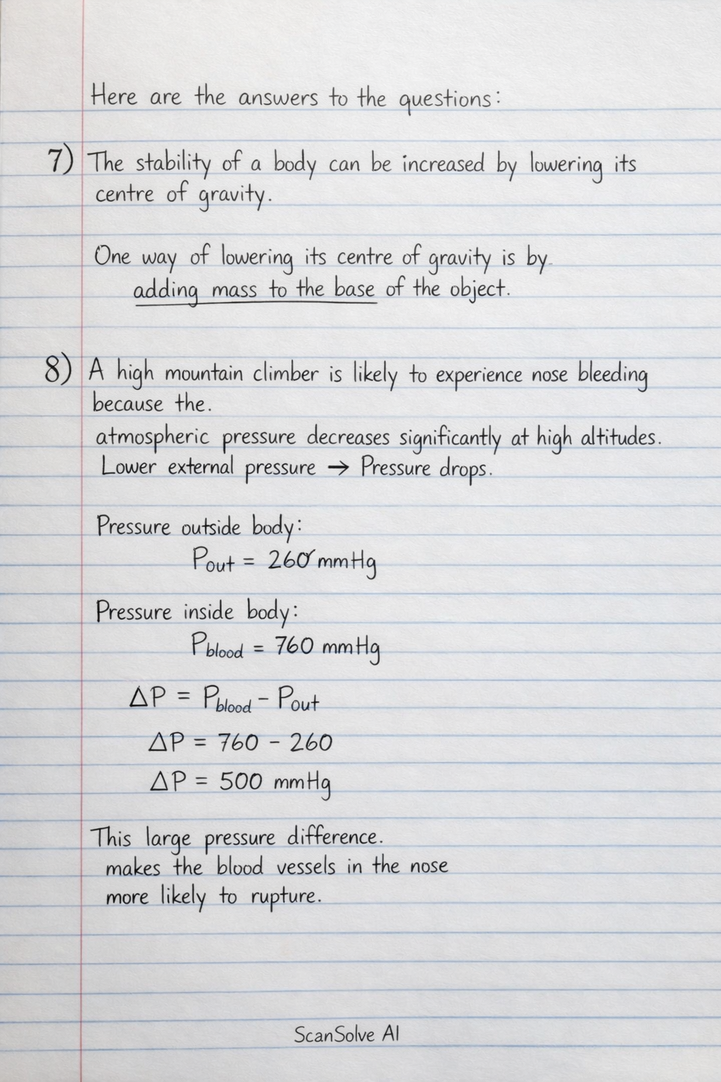 8) A high mountain climber is likely to experience nose bleeding because the atmospheric pressure decreases significantly at high altitudes. This lower external pressure creates a larger pressure difference compared to the relatively constant blood pressure inside the body, causing delicate blood vessels in the nose to rupture.