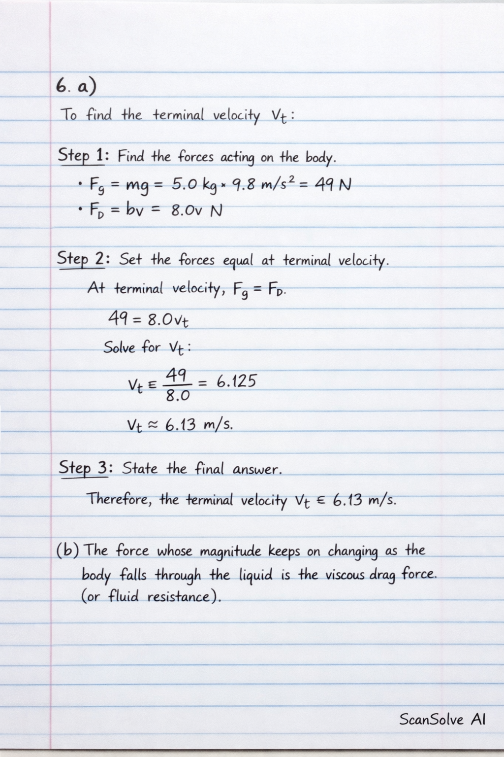 b) The force whose magnitude keeps on changing as the body falls through the liquid is the viscous drag force (or fluid resistance).