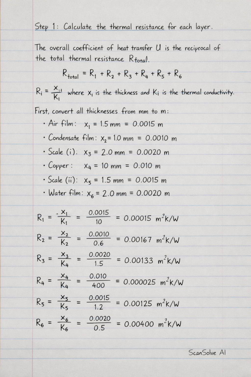 First, convert all thicknesses from mm to m: • Air film: • Condensate film: • Scale (i): • Copper: • Scale (ii): • Water film: