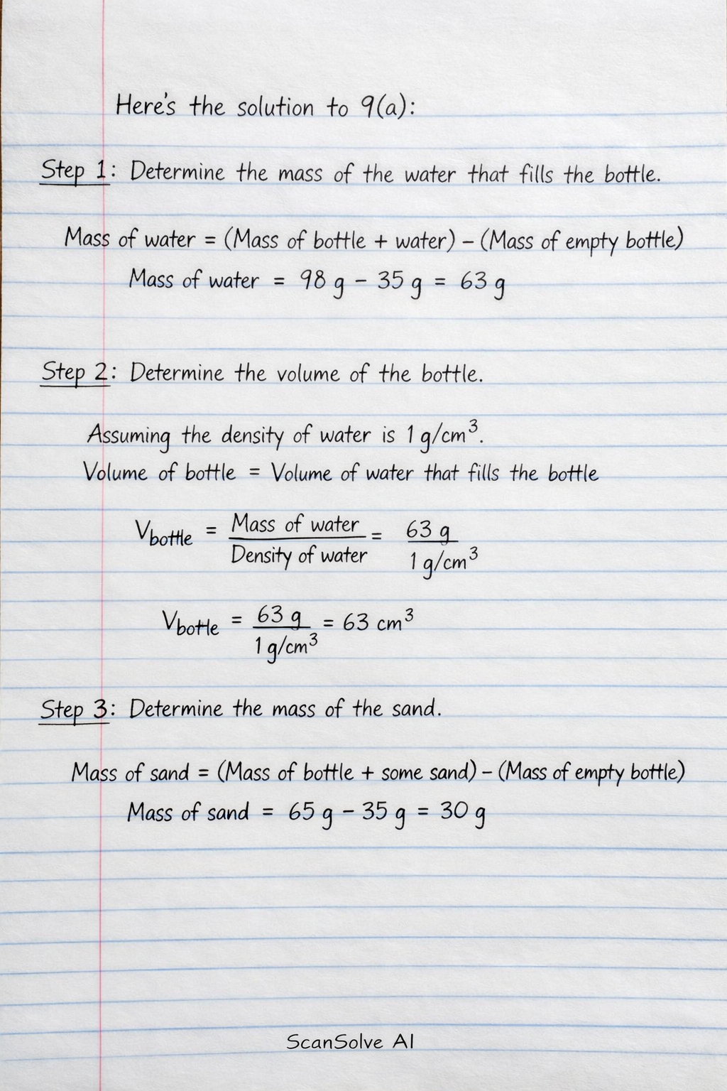 Mass of (sand + water) in the bottle = (Mass of bottle + sand + water) - (Mass of empty bottle)