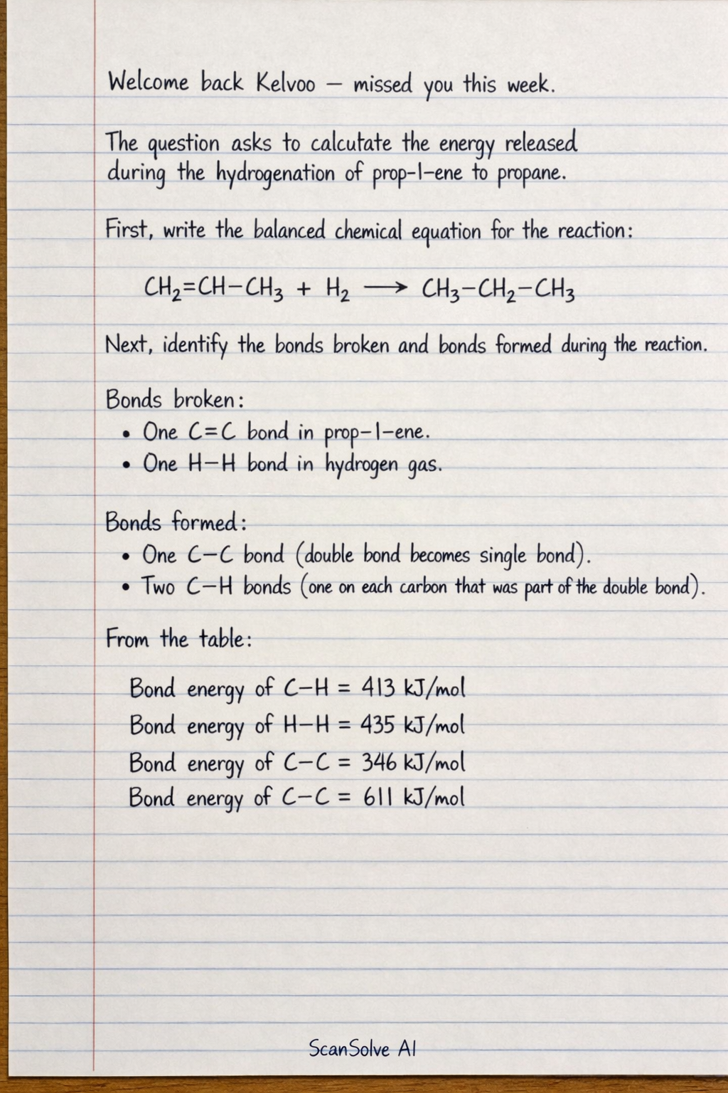 Welcome back Kelvoo — missed you this week. The question asks to calculate the energy released during the hydrogenation of prop-1-ene to propane.