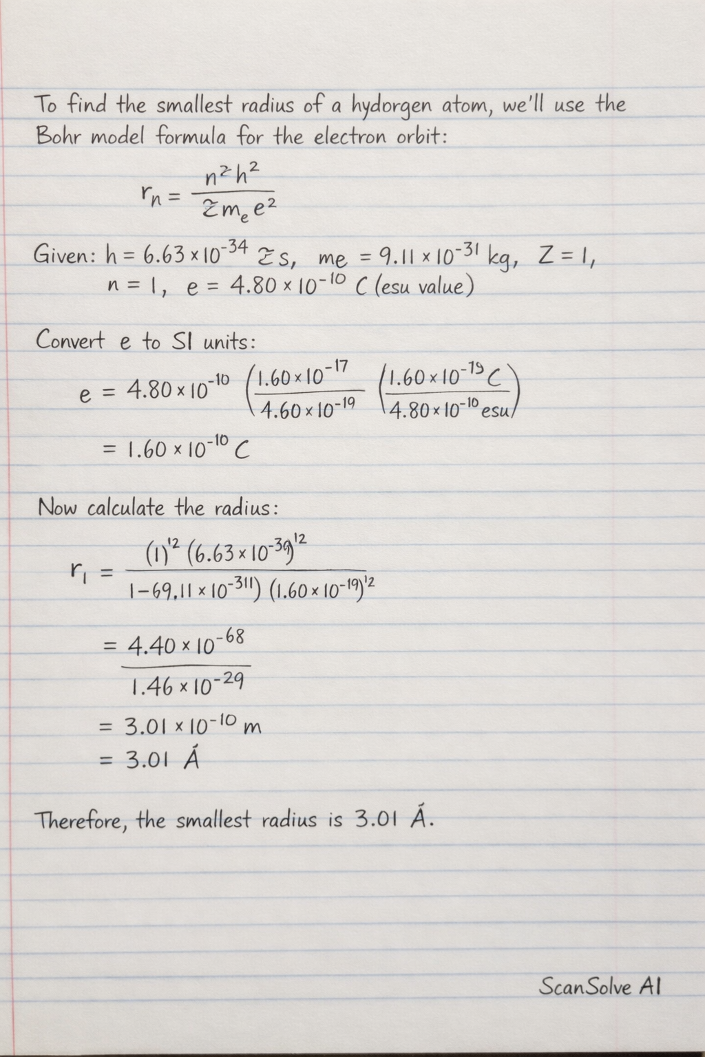 To compute the smallest radius of a hydrogen atom, we use the Bohr model formula for the radius of an electron orbit. The problem provides values for Planck's constant (h), mass of electron (m_e),