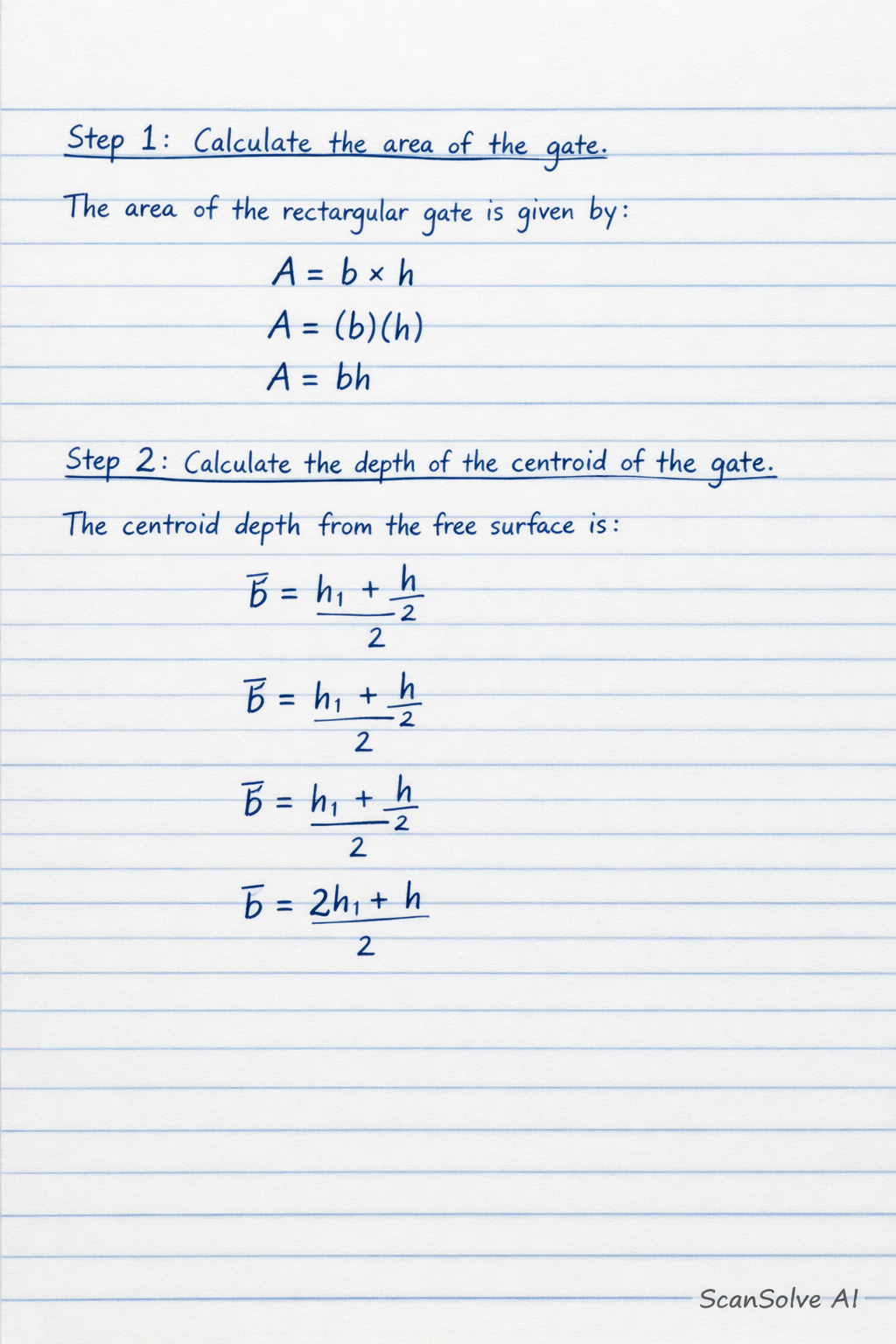 Assuming a vertical rectangular gate with width b and height h, submerged in water such that its top edge is at a depth h1 from the free surface: