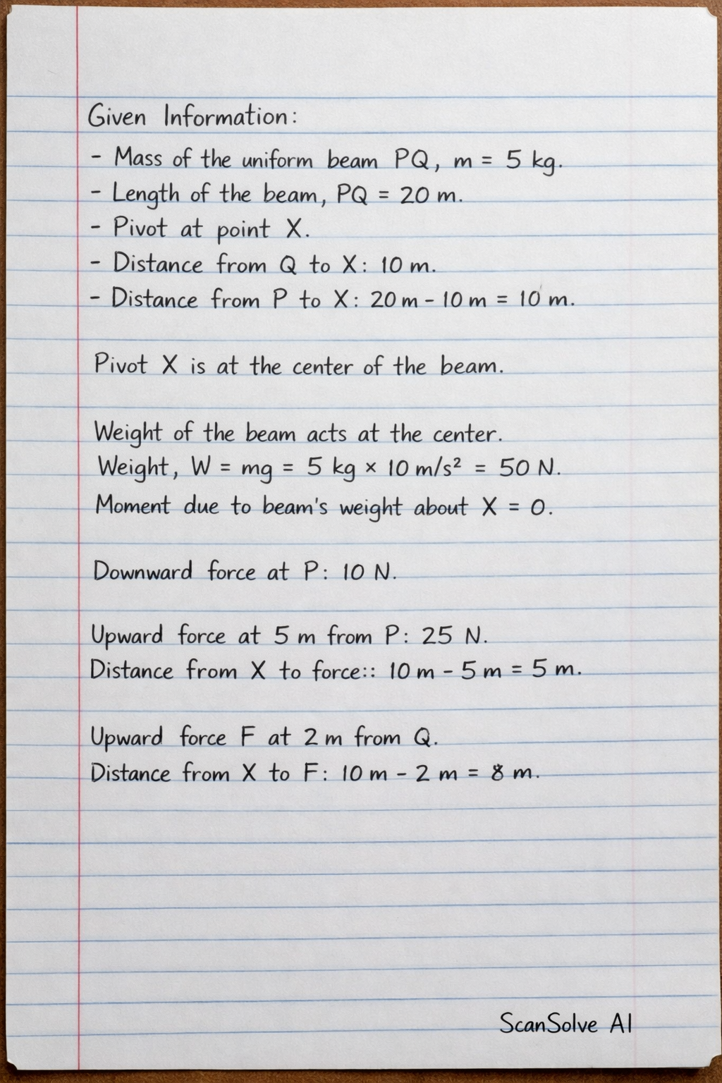 - Since the total length is 20 m, the distance from P to X is 20m−10m=10 m. This means the pivot X is at the center of the beam.