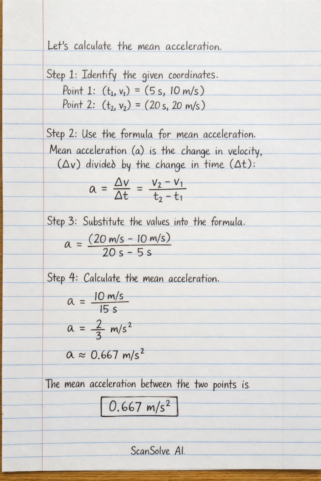 Mean acceleration (a) is the change in velocity (Δv) divided by the change in time (Δt):
