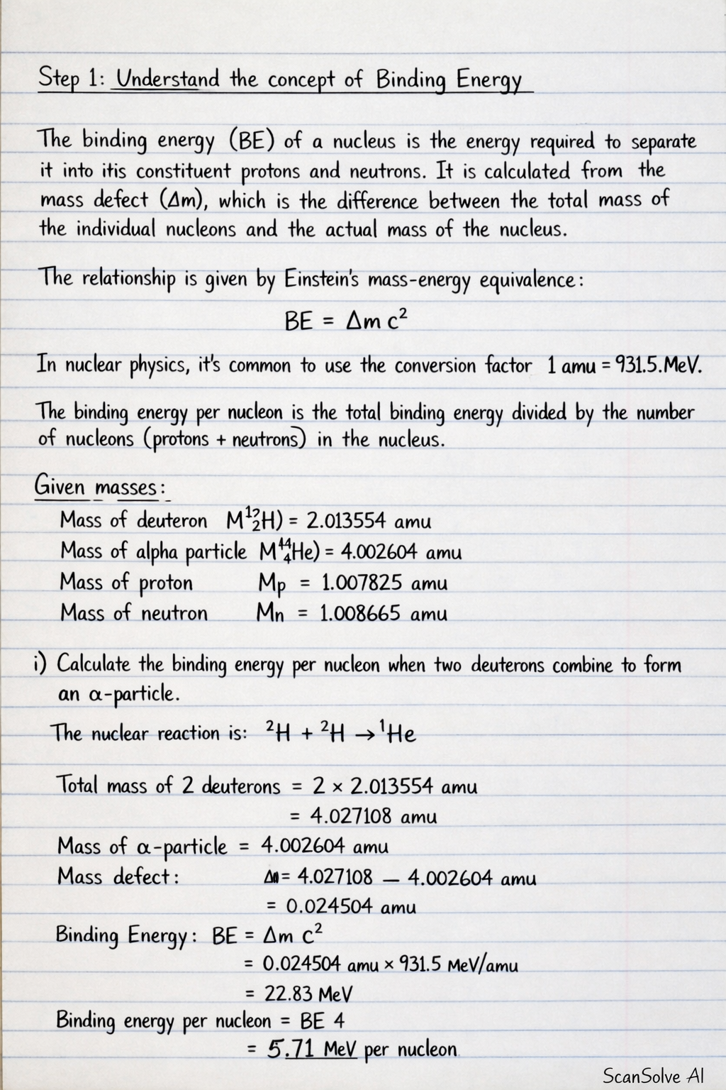 Step 1.5: Calculate the binding energy per nucleon. The -particle () has 4 nucleons (2 protons and 2 neutrons).