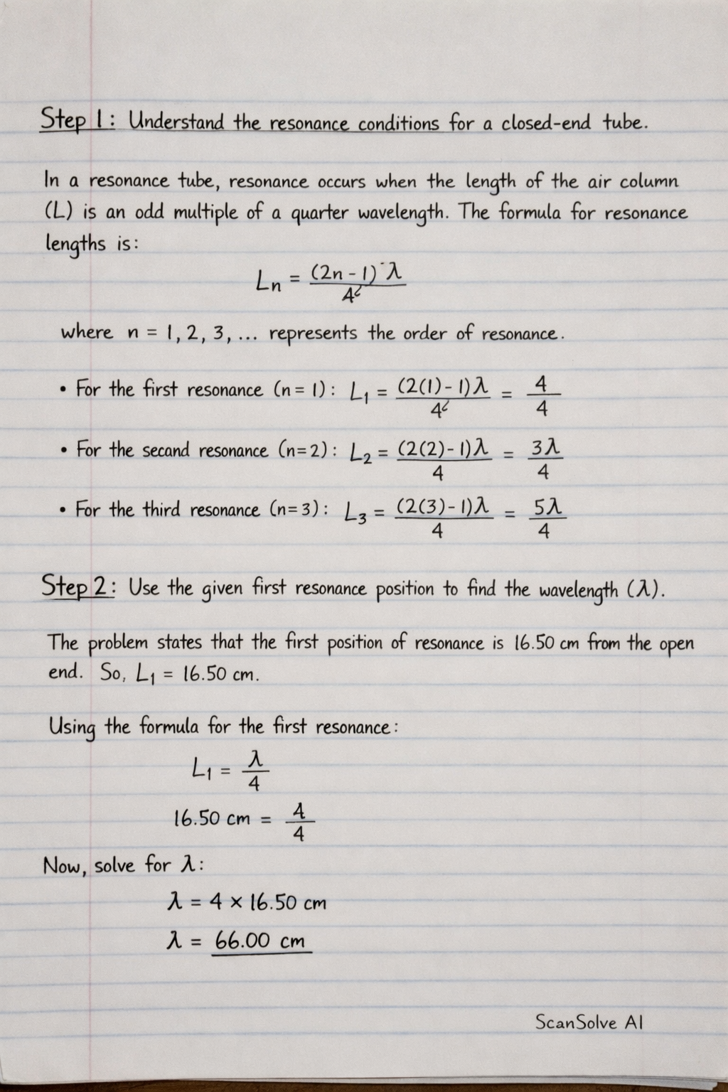 In a resonance tube (which is typically a closed-end tube due to the water column), resonance occurs when the length of the air column (L) is an odd multiple of a quarter wavelength. The formula for resonance lengths is: