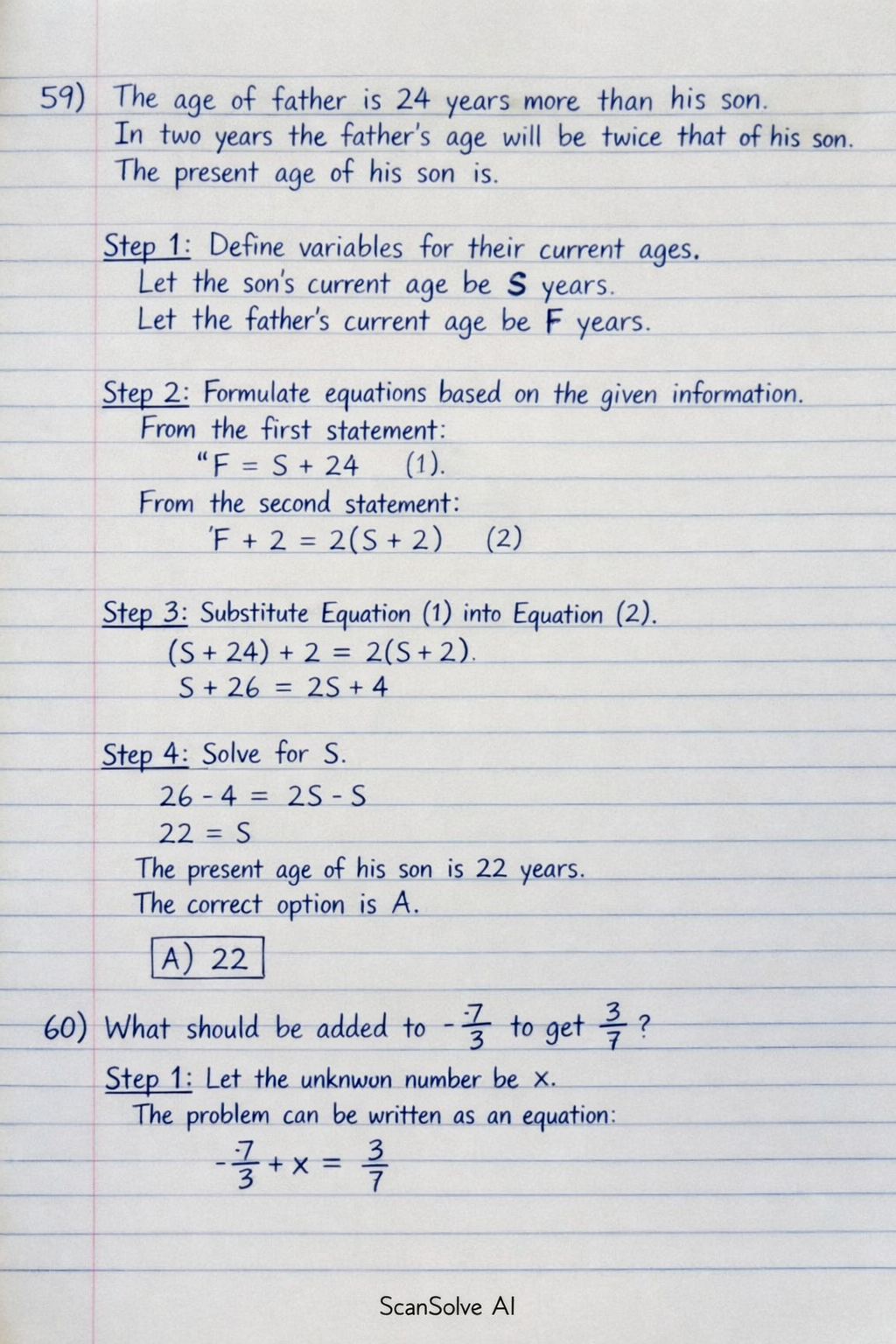 Step 2: Formulate equations based on the given information. From the first statement: "The age of father is 24 years more than his son." From the second statement: "In two years the father's age will be twice that of his son." In two years, the son's age will be . In two years, the father's age will be . So, we have: