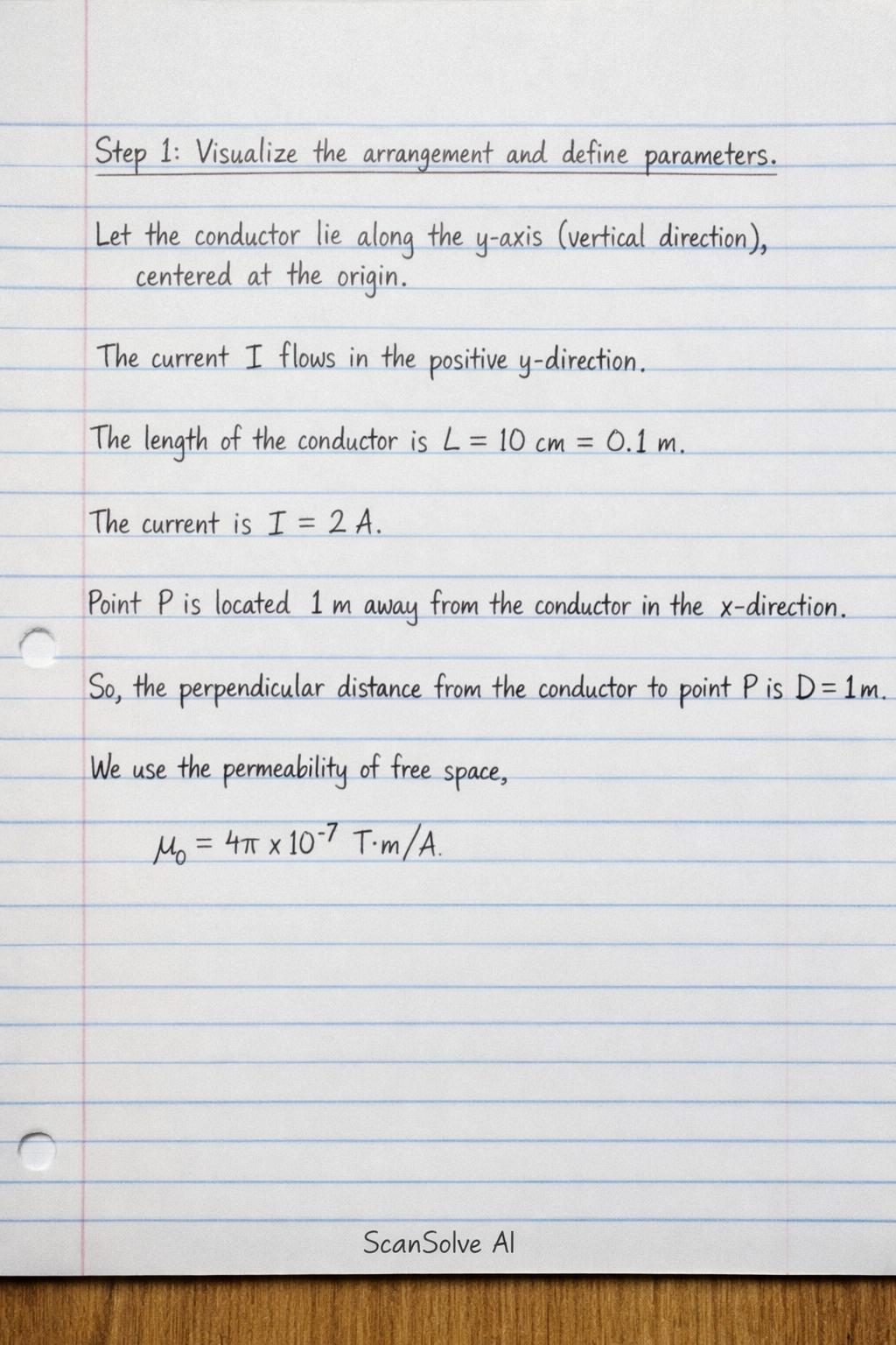 A conductor of length 10 cm carries a current of 2A in a vertical direction. A point P is placed 1 m away from the conductor in the X-direction. Determine the angle between the vertical axis and point P, and the magnetic field at point P using Biot-Savart law.