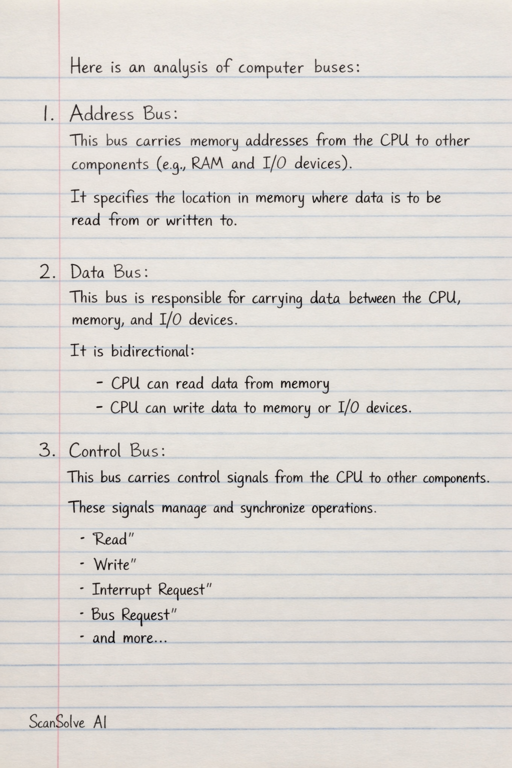 1. Address Bus: This bus carries memory addresses from the Central Processing Unit (CPU) to other components like RAM and input/output (I/O) devices. It specifies the location in memory where d