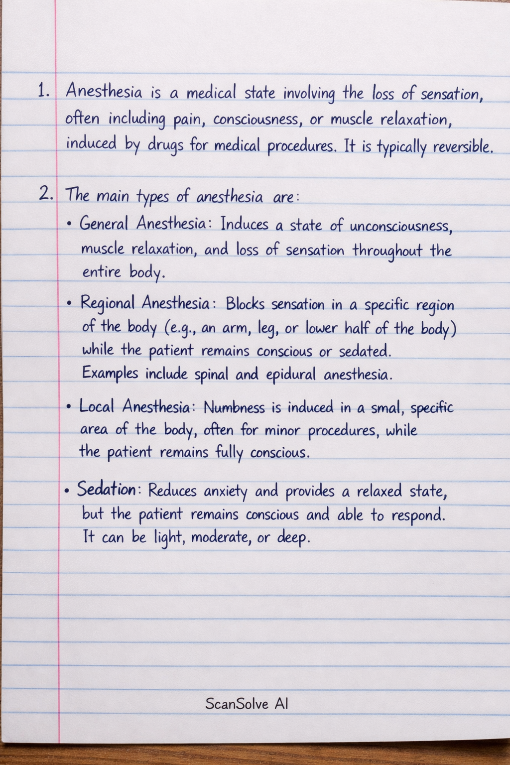 Regional Anesthesia*: Blocks sensation in a specific region of the body (e.g., an arm, leg, or lower half of the body) while the patient remains conscious or sedated. Examples include spinal and epidural anesthesia.