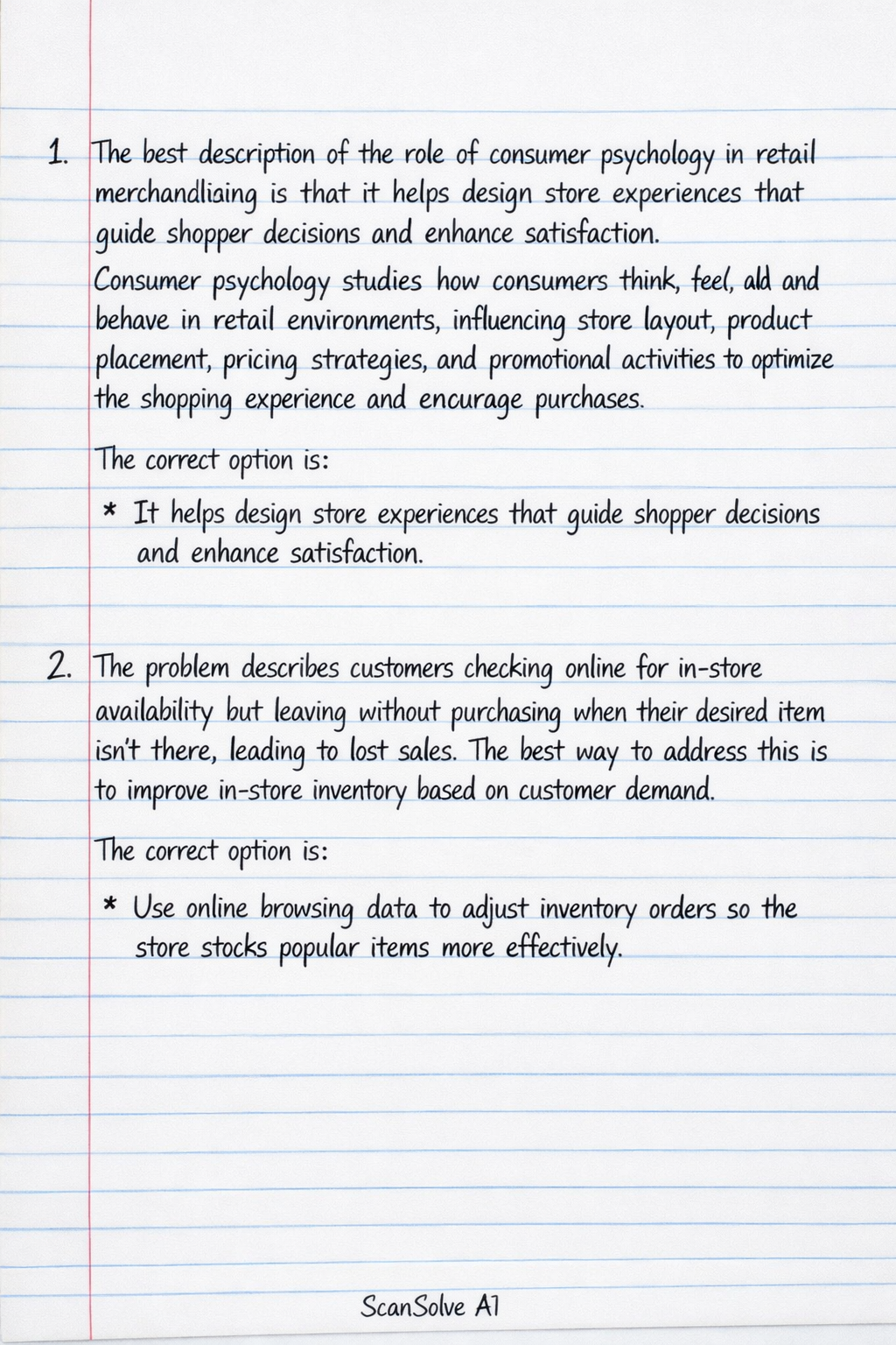 1. The best description of the role of consumer psychology in retail merchandising is that it helps design store experiences that guide shopper decisions and enhance satisfaction. Consumer psychology studies how consumers think, feel, and behave in retail environments, influencing store layout, product placement, pricing strategies, and promotional activities to optimize the shopping experience and encourage purchases.