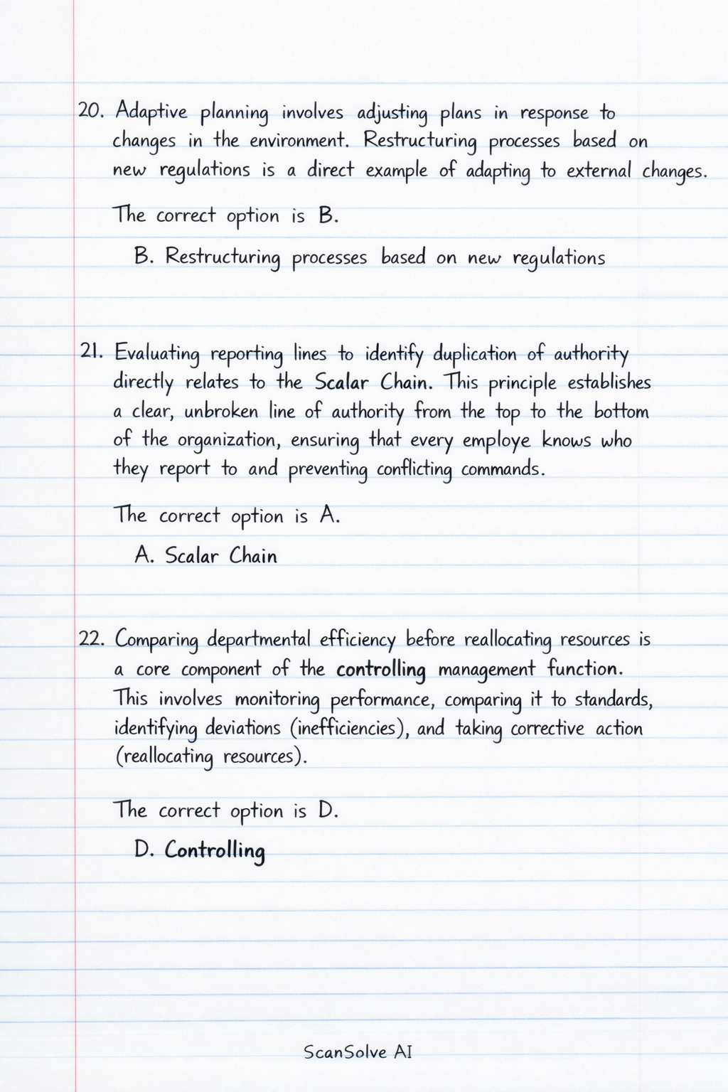 21. Evaluating reporting lines to identify duplication of authority directly relates to the Scalar Chain. This principle establishes a clear, unbroken line of authority from the top to the bottom of the organization, ensuring that every employee knows who they report to and preventing conflicting commands.