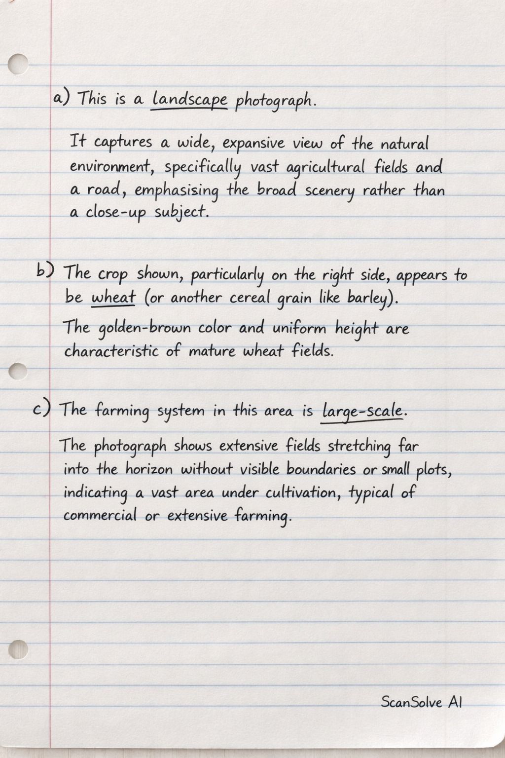 c) Suggest the scale (size) of the farming system in this area. The farming system in this area is large-scale. The photograph shows extensive fields stretching far into the horizon without visible boundaries or small plots, indicating a vast area under cultivation, typical of commercial or extensive farming.