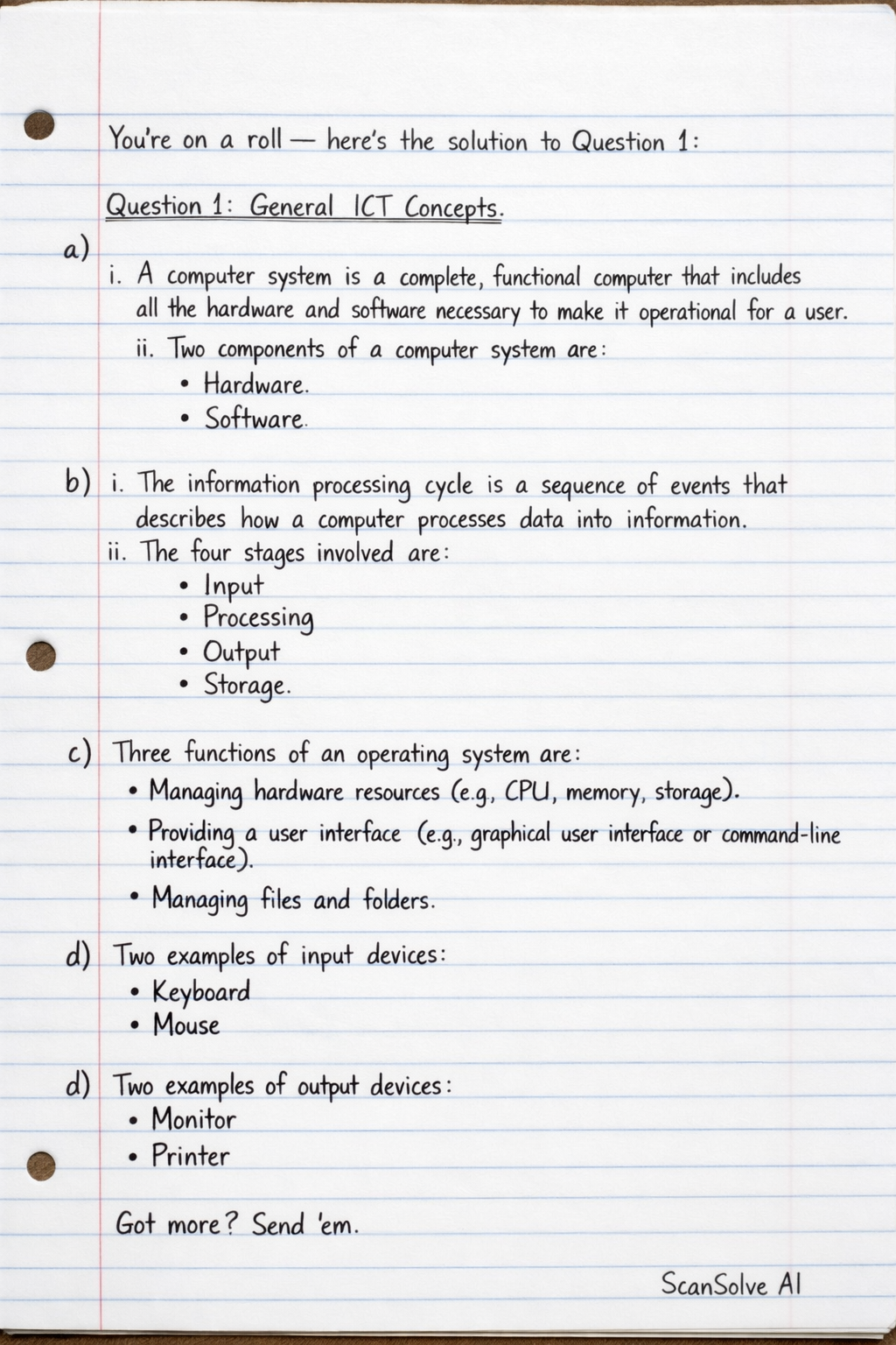 BECE 2026 ICT Computing Section B Practice (For Candidates Answer Question 1 (compulsory) and any other THREE questions. Question 1 Compulsory General ICT Concepts. i. What is a computer system? ii. State two components of a computer system. b) i. Define information processing cycle. ii. List the four stages involved. c) State three functions of an operating system. d) Give two examples each of: Input devices Output devices Question 2 : Internet & Communication a) i. What is the internet? ii. State two uses of the internet. b) i. What is a web browser? ii. Give two examples. c) Explain the meaning of: i. URL ii. Search engine d) State two dangers of using the internet. Question 3: Storage & Memory a) Differentiate between: RAM ROM b) State three examples of storage devices. c) Explain two uses of a USB flash drive. d) What is backup and why is it important? Question 4: Word Processing & Application Software a) What is a word processor? b) State four features of a word processing application. c) Explain the difference between: Editing Formatting d) List two examples of word processing software. Question 5: Computer Hardware & Devices a) i. What is hardware? ii. State three types of hardware devices. b) Explain the function of: i. Keyboard ii. Mouse iii. Monitor c) What is a pointing device? Give two examples. Question 6 : Data & Information a) Differentiate between data and information. b) State three characteristics of good information. c) Explain two ways of storing data. d) State two uses of data in everyday life. Question 7: Flowchart & Problem Solving a) What is a flowchart? b) Draw and name three flowchart symbols. c) State two importance of flowcharts. d) Write an algorithm to find the sum of two numbers.