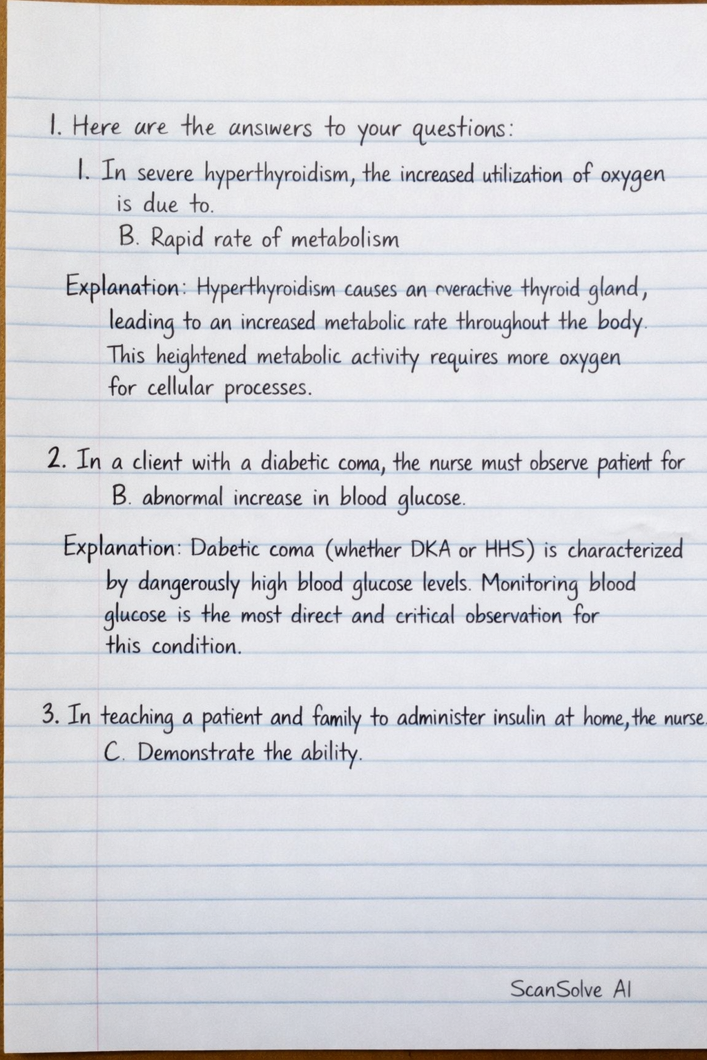 In severe hyperthyroidism, the increased utilization of oxygen is due to ………….. a. Rapid rate of absorption b. Rapid rate of metabolism c. Decrease rate of utilization of carbon dioxide d. Severe break down of blood cells. . 2. In a client with a diabetic coma, the nurse must observe patient for………………… a. The presence of sugar content in the urine b. abnormal increase in blood glucose c. Polydypsia d. Polyphagia 3. In teaching a patient and family to administer insulin at home, the nurse ….. a. Demonstrate the action of insulin to only the patient b. Demonstrate how to take other prescribed drugs c. Demonstrate the ability to prepare a syringe with insulin solution d. Demonstrate the action of oral drugs . 4. To control diabetes mellitus, the nurse should advice the patient to take the following foods in moderation except a. cabbage bread fruit milk 5. In providing nursing care for a client diagnosed of diabetes mellitus, the patient said he enjoys eating pastries. The nurse’s response should be …. a. “take pastries in moderation” “you should eat pastries freely” “you must avoid eating pastries” “consult your counselor before your take pastries” ……. 6. In diabetes mellitus, the priority of the nurse is to correct ………………….. a. fluid balance b. knowledge deficit c. altered nutrition d. ineffective family coping 7. In acute phase of Diabetic Ketoacidosis the priority nursing action is to …………….. a. administer intravenous Regular insulin b. administer intravenous 5% Dextrose c. correct alkalosis d. apply an ECG monitor 8. A client diagnosed with NIDDM has blood glucose of 600mg/dl, the client was experiencing polyuria, polydipsia, weight loss and weakness. The nurse expects which of the following diagnoses? a. diabetic ketoacidosis b. hypoglycaemia c. hyperglycaemia hyperosmolar nonketotic syndrome d. pheochromocytoma 9. A nurse has collected data on a client with diabetes mellitus. The FBS IS 130 mg?dl, temperature 38ºC, respiration is 22 breathes per minute, and blood pressure 140/80mmHg. Which of the Following is the most concern to the nurse? a. pulse rate b. blood pressure c. blood glucose d. temperature 10. The Non-Insulin Dependent Diabetes Mellitus affects about................. of all cases. a. 50-60% b. 70-80% c. 80-85% d. 90-95%. 11. The thyroid gland produces the following hormones except: a. calcitonin b. cortisol c. thyroxine d. triiodothyronine. 12. The immediate diagnostic test a nurse can conduct on a patient suffering from diabetes later in a day is.................................. a. urea and creatinine b. fasting blood sugar c. blood nitrogen level. d. random blood sugar. 13. The common causes of hypoglycemia in diabetes mellitus are present if the patient.............. a. takes in more food than necessary b. does not tolerate the prescribed drugs c. takes overdose of antidiabetic drugs d. takes more fruit drinks. 14. In caring for a diabetic patient, the nurse must change the infusion of normal saline to dextrose when the blood glucose level is........................... a. 13mmol/L or less b. 13mmol/L or more c. 15mmol/L or more d. 15mmol/L or less 15. The type II diabetes mellitus commonly affects........................................... a. newly born children b. persons less than 30 years c. persons over 30 years d. person with hypertension and kidney failure. 16. Rapid-acting insulin drugs often works within.......................... a. 20 hours b. 15 hours c. 3 hours d. 1 hour 17. Management of diabetes mellitus is directed toward....................................... a. reducing metabolic activities b. establishing and maintaining metabolic control c. treatment of complications to avoid death d. increasing the body’s insulin resistance 18. Which of the following findings by the nurse would indicate that the client is having an insulin reaction? a. air hunger and acetone breathe b. vomiting and flushed skin c. nausea and headache d. confusion and diaphoresis 19. The cardinal signs and symptoms of diabetic ketoacidosis include the following except................... a. air hunger and acetone breathe b. vomiting and flushed skin c. nausea and headache d. confusion alone 20. Diabetic ketoacidosis is common in............................................................................... a. Type I b. Type II c. both Type I and II d. none of them The components of management of diabetes mellitus include Diet Exercise Fasting Medication I, II and III I, II and IV II, III and IV I, II, III and IV Symptoms that occur prior to diabetic coma include the following EXCEPT Dry skin Hunger Rapid pulse Thirst 23 .A typical sign that a patient with diabetic ketoacidosis is likely to exhibit on admission is A slow pulse rate Deep rapid respiration Dilated pupils Excessive perspiration Which of the following substances account for the sweet, fruity odour that a nurse notes in the breath of a patient with hyperglycaemic coma Amino acid Glycogen Ketone bodies Urea The nurse encourages strict diabetic control in the patient prone to diabetic nephropathy knowing that the renal tissue changes that may occur in this condition include Uric acid calculi and nephrolithiasis Renal sugar – crystal calculi and cyst Lipid deposits in the glomeruli and nephrons Thickening of the glomerular basement membrane and glomerulosclerosis Diabetic coma results from an excess accumulation in the blood of Glucose from rapid CHO metabolism causing drowsiness Ketones from rapid fat breakdown, causing acidosis Nitrogen from protein catabolism causing ammonia intoxication Sodium bicarbonate causing alkalosis A patient with diabetes mellitus says “I cannot eat big meals. I prefer eating snacks throughout the day”. The nurse should explain that Large meals can bring about weight problems Regulated food intake is basic to diabetic control Salt and sugar restriction is the main concern Small frequent meals are better for easy digest