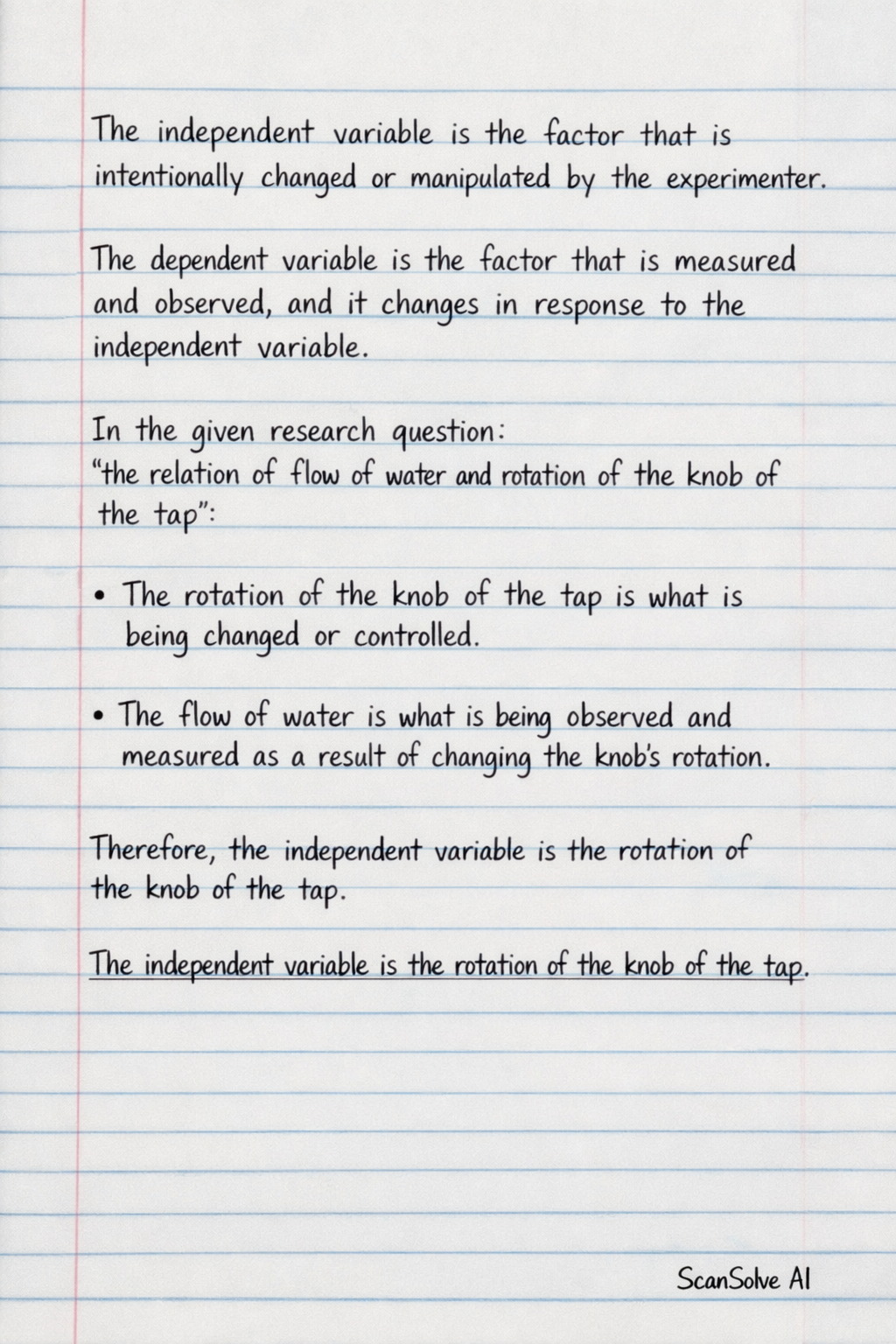 The independent variable is the factor that is intentionally changed or manipulated by the experimenter. The dependent variable is the factor that is measured and observed, and it changes in response