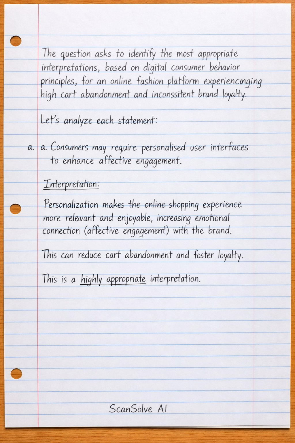 The question asks to identify the most appropriate interpretations, based on digital consumer behavior principles, for an online fashion platform experiencing high cart abandonment and inconsistent brand loyalty.